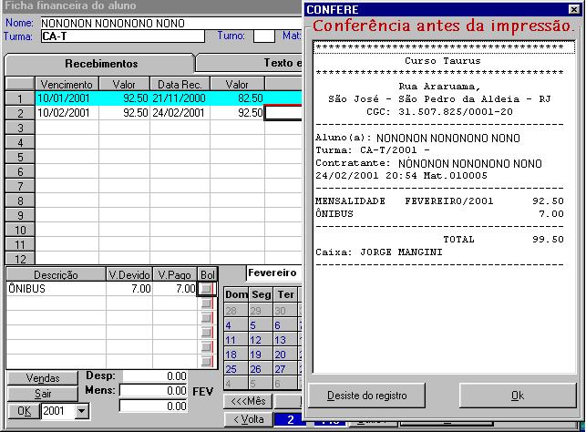 Quitação de uma mensalidade e despesa extra efetuada na escola com emissão de recibo e agendamento